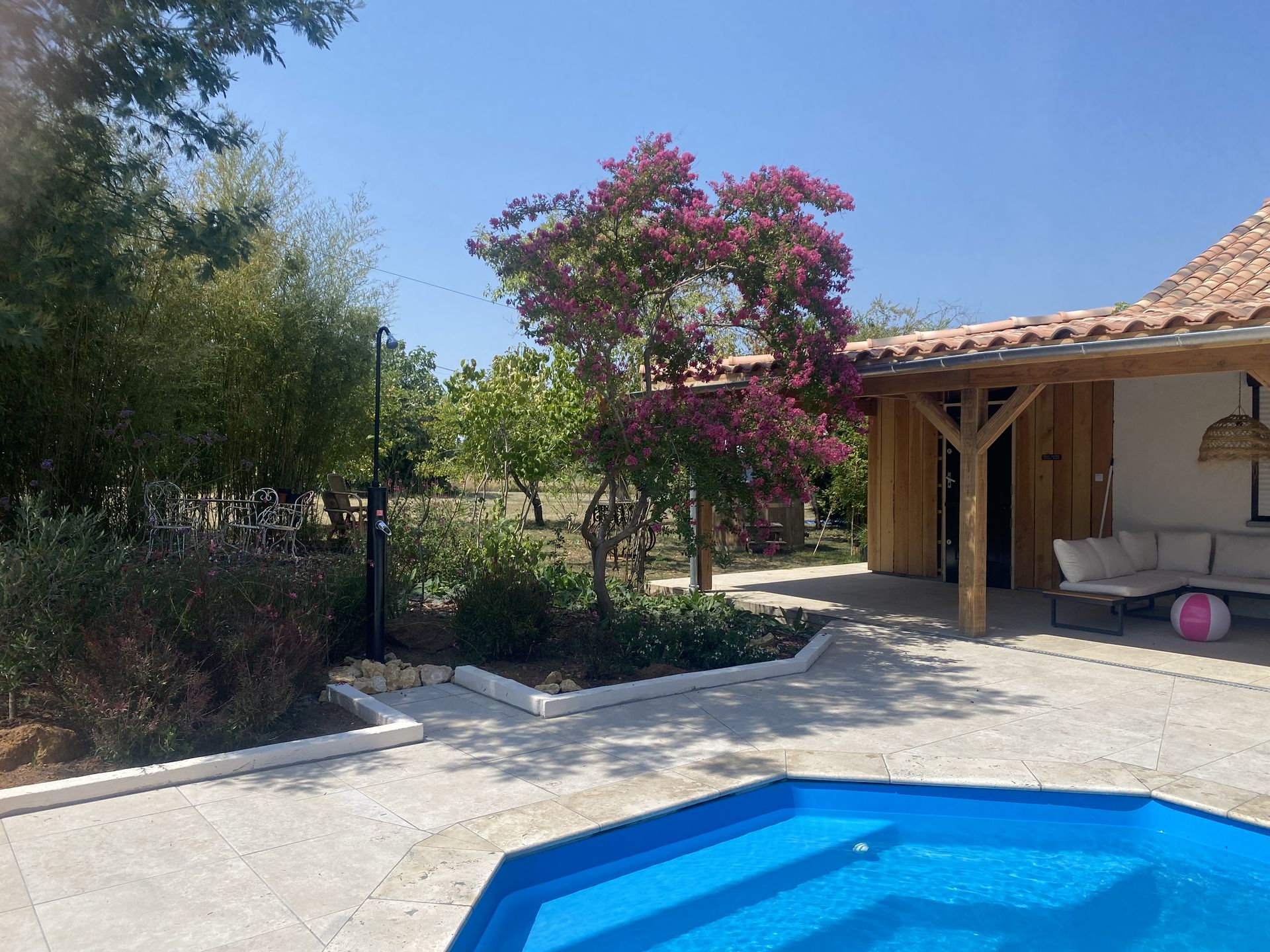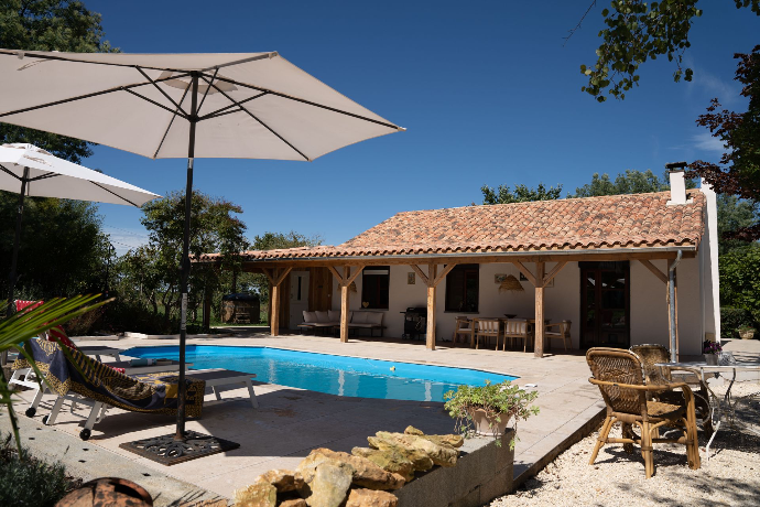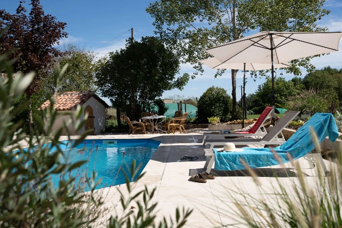 De veranda is een heerlijke plek om te genieten van het buitenleven. ’s Ochtends drink je er je koffie in de zon, overdag zoek je er de schaduw op, en ’s avonds is het de ideale plek om samen te eten of na te praten met een glas wijn. Er is een gasbarbecue aanwezig. Vanaf de veranda kijk je uit over het zwembad en de groene omgeving. Rust, ruimte en het echte Franse vakantiegevoel komen hier vanzelf samen.